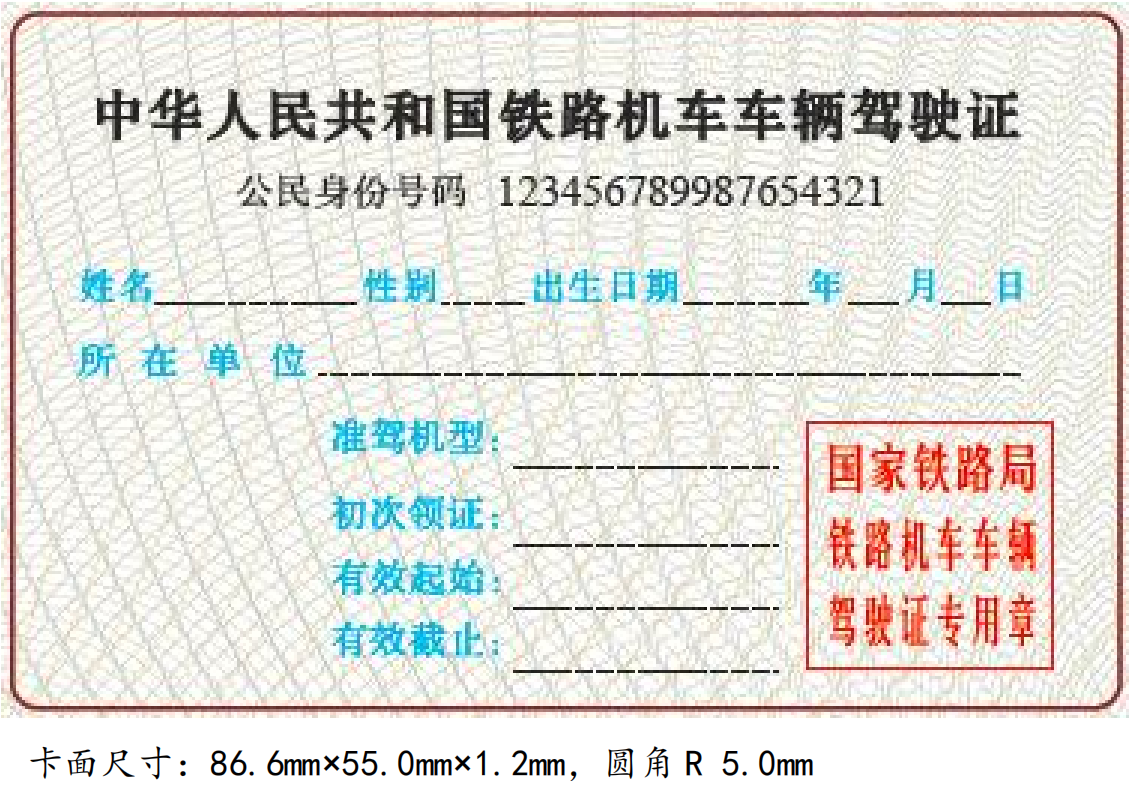 鐵路機車車輛駕駛證正面示意圖