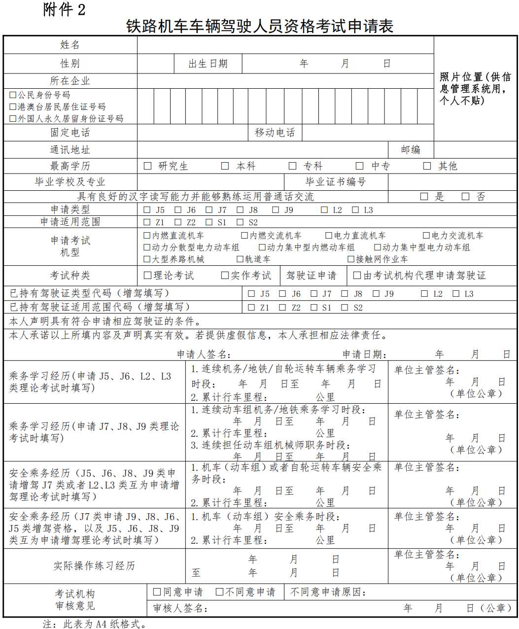 ?。ㄒ唬┩暾顖蟮蔫F路機車車輛駕駛人員資格考試申請表(格式見附件2);