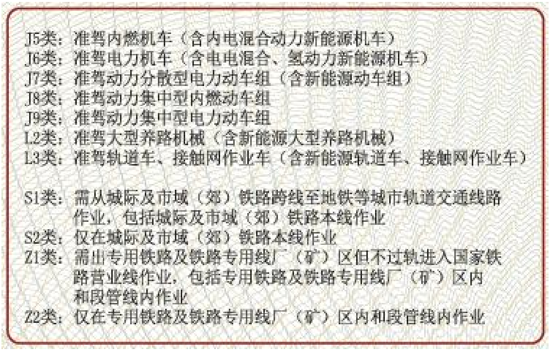 J5類:準駕內燃機車(含內電混合動力新能源機車),按適用范圍分為J5、J5S1、J5S2、J5Z1、J5Z2類型;