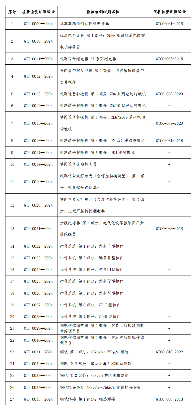 國家鐵路局關于發布鐵路專用產品檢驗檢測細則的公告(2024年第2批)