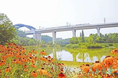 高速列車通過滬寧城際高鐵仙林特大橋。 羅春曉 攝