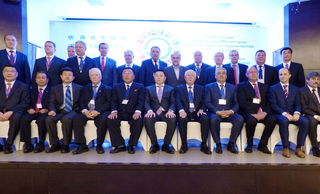6月2日至5日,國家鐵路局副局長朱望瑜(后排右一)率團出席在蒙古國首都烏蘭巴托舉行的鐵路合作組織(下稱鐵組)第四十三屆部長會議,會議審議通過了鐵組2014年工作報告、運輸政策和發展戰略專門委員會工作報告、運輸法專門委員會工作報告、國際客、貨協及其辦事細則修改補充事項和完善鐵組基本文件臨時工作組工作進展情況報告。20個鐵組成員國派團參會。