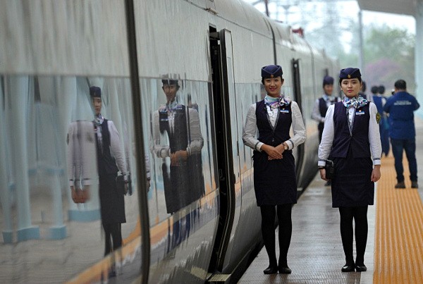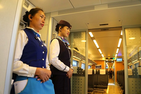 圖為海南環島高鐵的乘務員在迎接旅客。