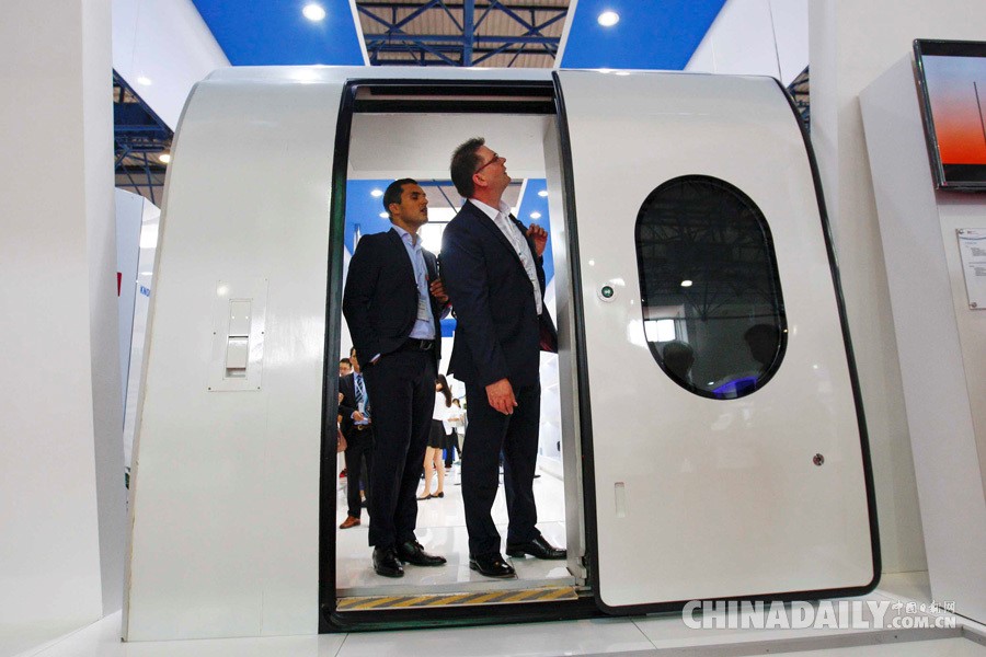 圖為IFE展臺,兩位外國參展商觀摩壓力密封塞拉門,該拉門系統(tǒng)廣泛應(yīng)用高鐵動車。