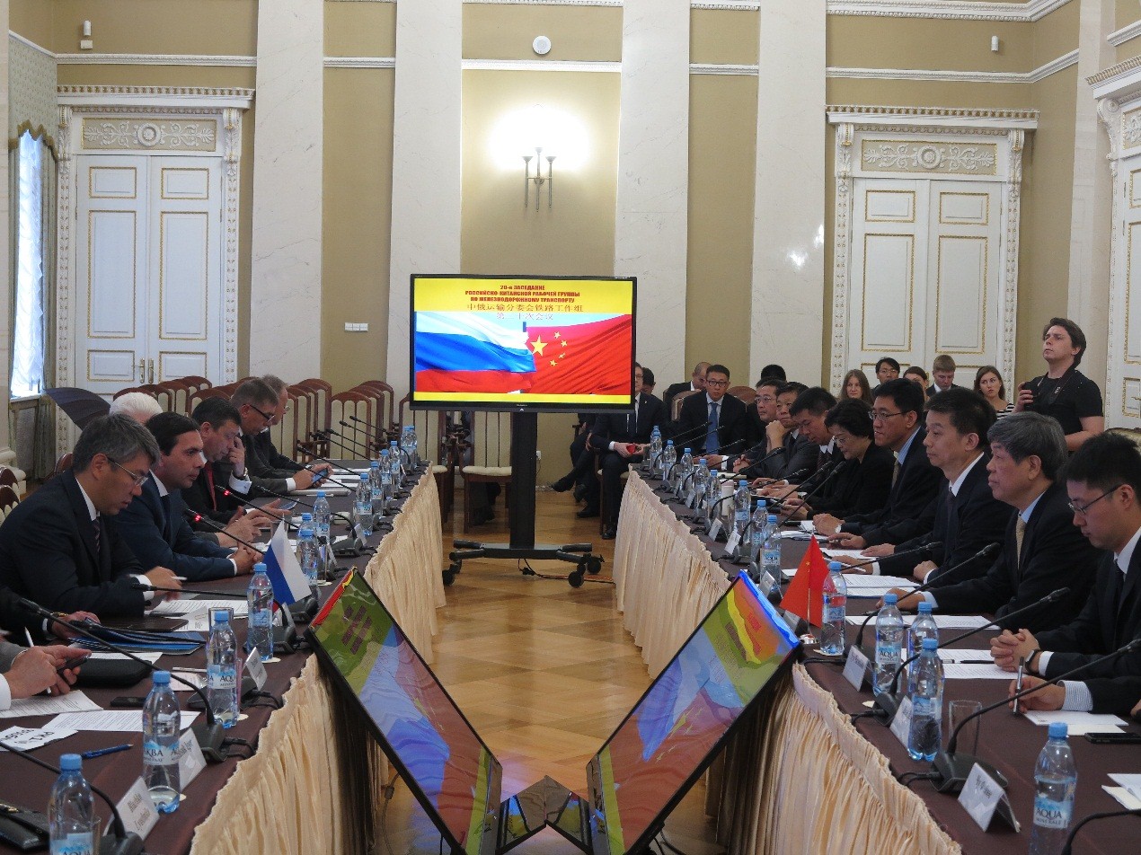 陸東福(右二)與俄羅斯聯邦運輸部副部長齊杰諾夫(左一)共同主持召開中俄運輸分委會鐵路工作組第二十次會議