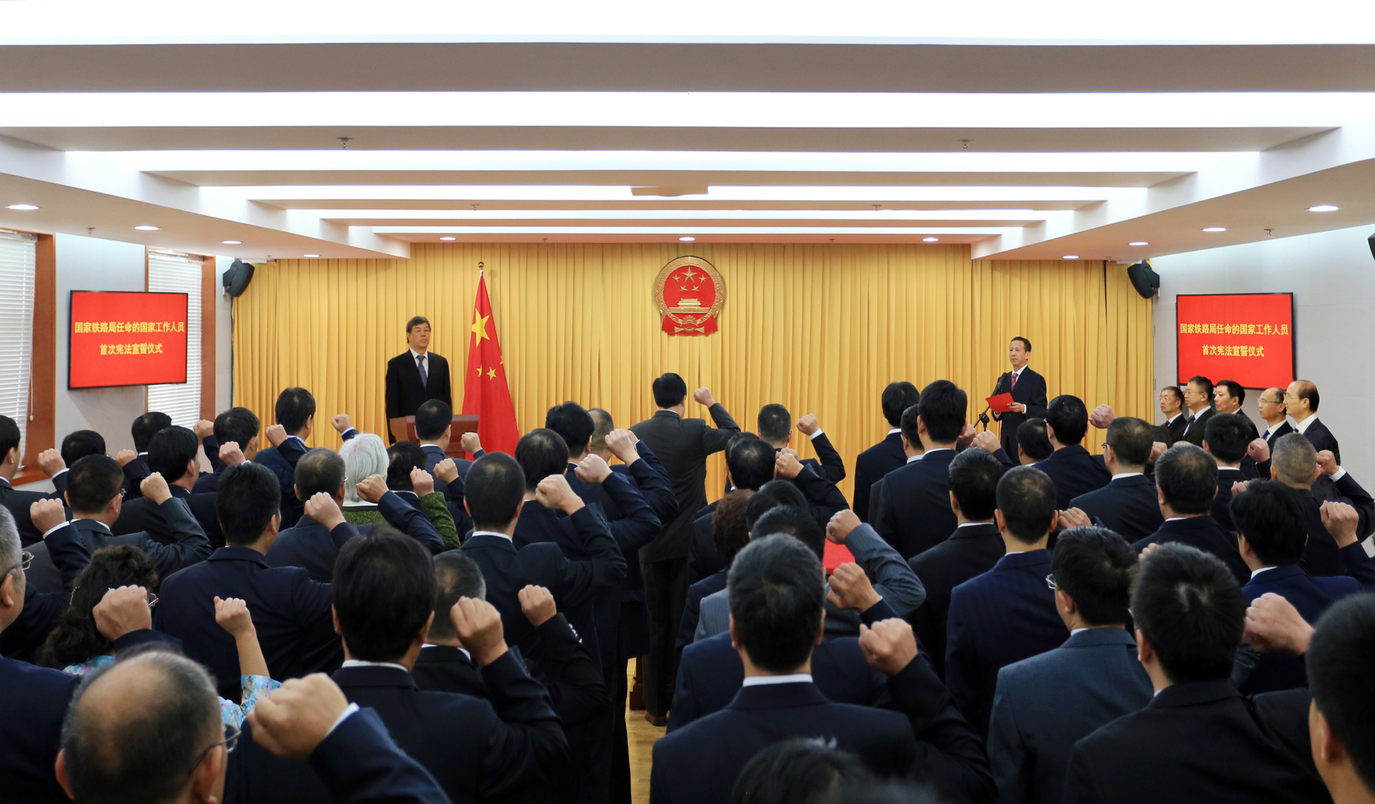 9月21日下午,國家鐵路局在局機關首次舉行憲法宣誓儀式,國家鐵路局局長陸東福監誓,局黨組成員參加儀式。今年以來國家鐵路局任命的處級以上干部,以及局總工程師、安全總監,局機關、各地區鐵路監管局、局屬事業單位處級以上領導干部代表,共150人依法進行憲法宣誓。
