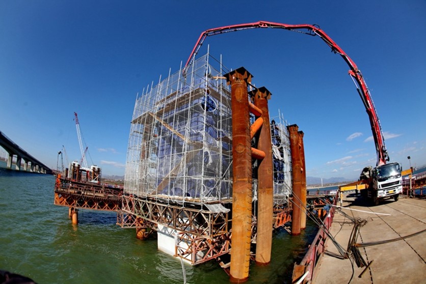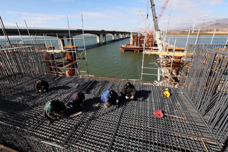 新建京(北京)張(張家口)鐵路官廳水庫特大橋施工現場。