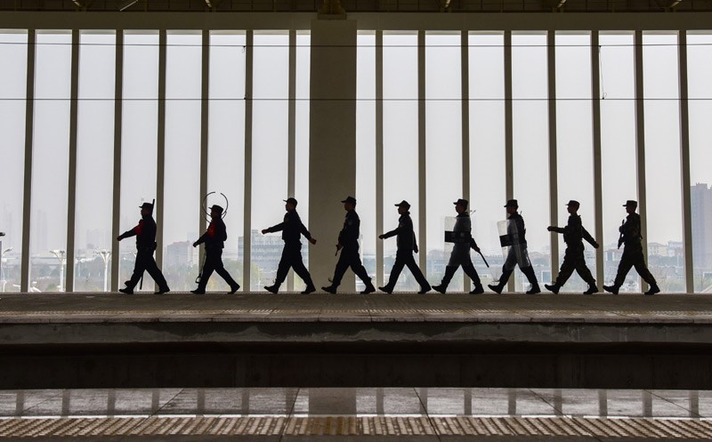 春運臨近,武漢鐵路警方聯(lián)合孝感市公安局、武警、廣場綜合治理等部門,在湖北省孝感東站,開展了一場聯(lián)動應急處置演練。程敏 攝