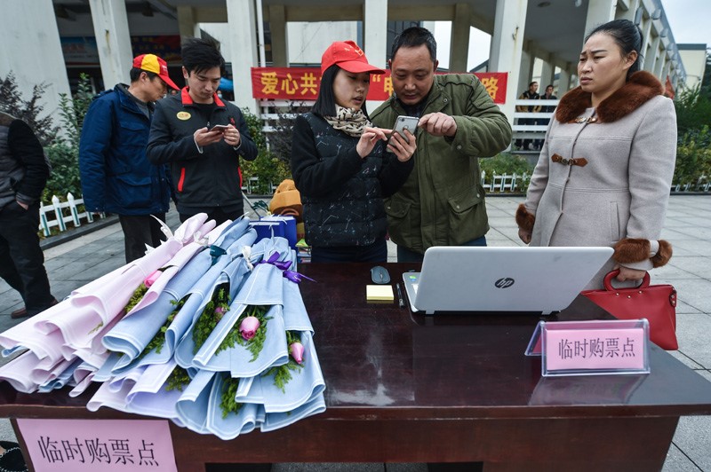 志愿者在余姚火車站前幫助外來務工人員預定春節(jié)回程火車票。徐昱 攝