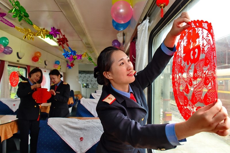 福州客運段乘務員在福州開往廣安的農民工專列上布置餐車。張國俊 攝