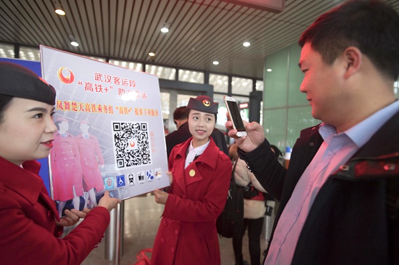 武漢客運段開通“鳳舞楚天高鐵乘務隊”微信公眾號,圍繞旅客需求,提供急救、訂送餐、失物招領信息發布、免費輪椅、列車時刻查詢等便民服務,讓旅客出行更加便捷,為春運助力。肖藝九 攝