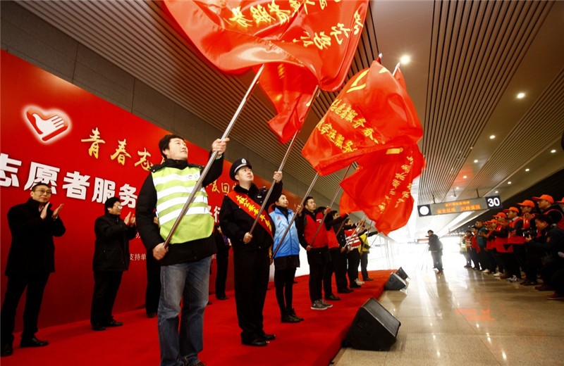 中國青年志愿者服務春運“暖冬行動”2017年啟動儀式在鐵路上海虹橋站舉行。青年志愿者將開展引導咨詢、秩序維護、重點幫扶和應急救援等志愿服務。方喆 攝