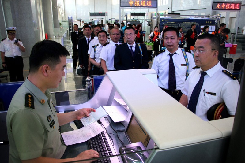 新疆霍爾果斯邊檢站工作人員為9001次國際旅客列車工作人員辦理出境手續。