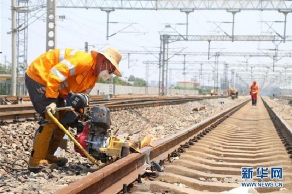 京滬鐵路沿線的晏城站,濟南鐵路局濟南工務段的鐵路焊軌工在高溫下作業。(圖片來源:新華網)