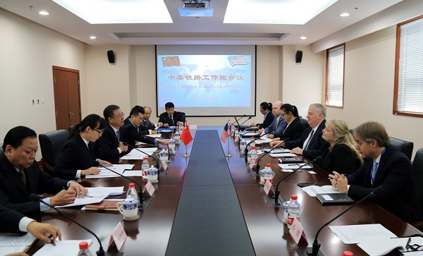 當日上午國家鐵路局副局長于春孝(左三)與美國聯邦鐵路署副署長勞比(右三)共同主持召開了中美鐵路工作組會議。雙方就鞏固中美鐵路合作交流機制、鐵路標準、安全監管、運輸監管、產能合作等問題廣泛交換了意見。美國貿易發展署、美國駐華使館,中國中車、北京交通大學等單位參加了會議。