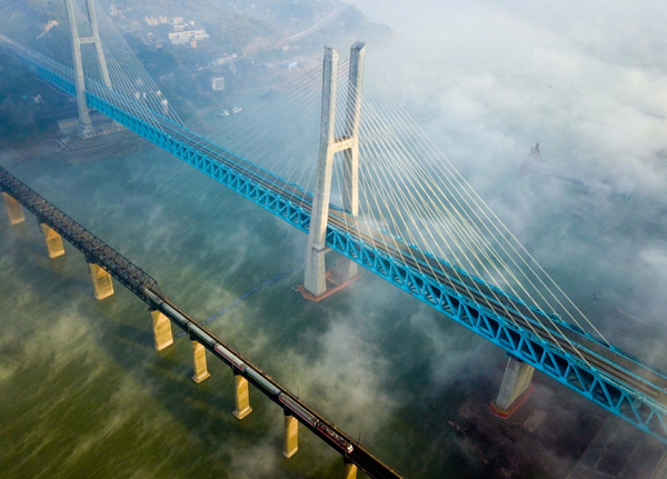 新白沙沱長江特大橋全線長約5.32公里,其中主橋全長920米,是渝貴鐵路跨越長江的重要通道和關(guān)鍵控制性工程。該橋上層為四線客車線,設(shè)計時速200公里;下層為兩線貨車線,設(shè)計時速120公里。據(jù)介紹,渝貴鐵路開通后,列車通過這座大橋最快僅需16.56秒。圖為新白沙沱長江特大橋(后)和修建于20世紀50年代的白沙沱長江大橋(前)。