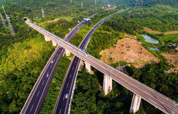 這是2016年10月11日無人機拍攝的海南環島高鐵東線三亞段。