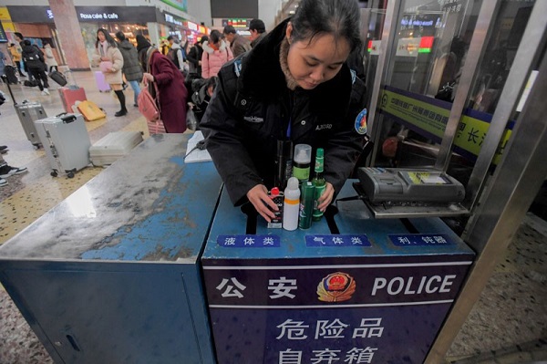 中國鐵路廣州局集團有限公司長沙火車站全面強化安檢工作,提高服務水平,全力保障旅客平安順利出行。圖為工作人員在長沙火車站整理違禁品。