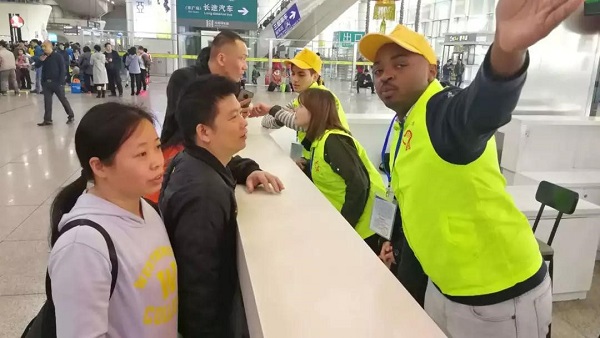 外籍青年志愿者在廣州南站服務(wù)旅客。(來源:人民鐵道網(wǎng))