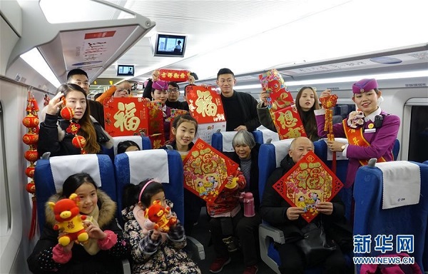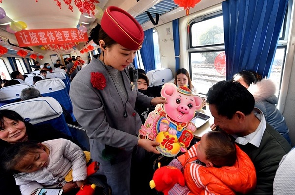在貴陽北開往寧波的G2334列車上,乘務(wù)員為旅客送上春聯(lián)、福字掛歷和生肖豬玩偶等新年禮品。(來源:新華社)