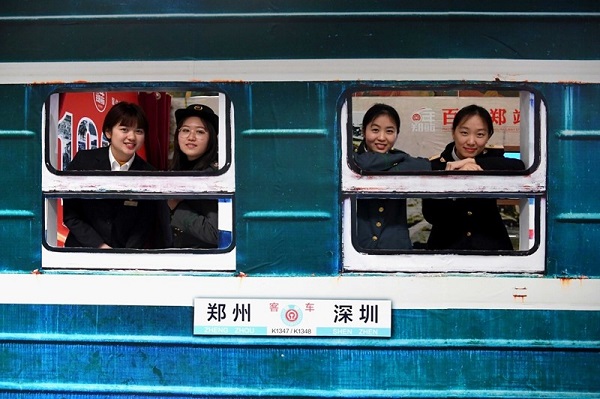 鄭州火車站在站內(nèi)開設(shè)“百年鄭站時光機(jī)”,體驗者穿著不同時期的鐵路職工工作服在“綠皮車”造型展板前留影。(來源:新華社)