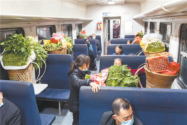 近日,沿線村民乘坐7266次“慢火車”外出賣菜。