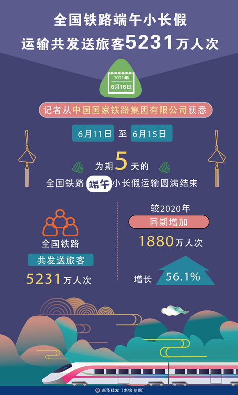 6月11日至6月15日,為期5天的全國鐵路端午小長假運輸圓滿結束,全國鐵路共發送旅客5231萬人次,較2020年同期增加1880萬人次、增長56.1%。