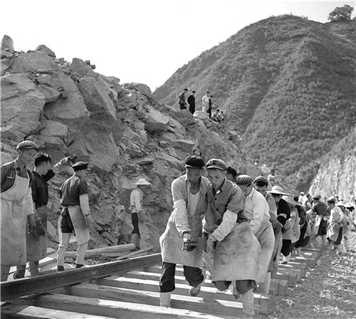 1955年,寶成鐵路建設者在緊張地鋪軌。