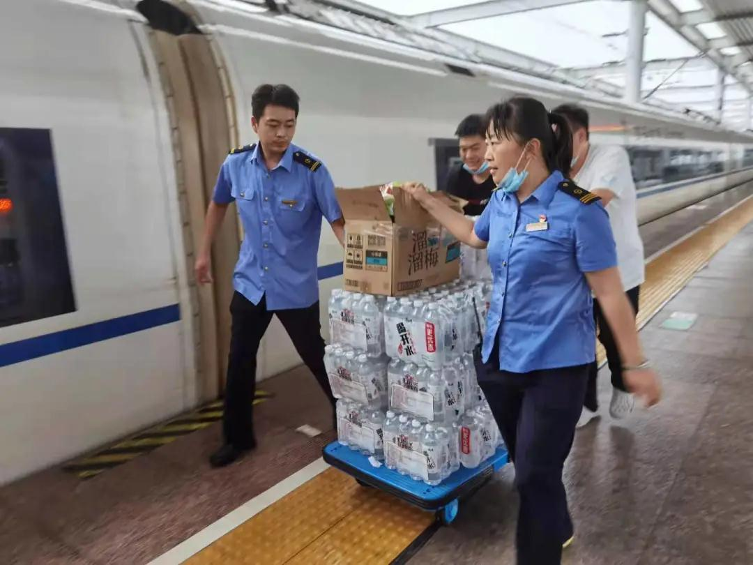 7月20日10時,滯留在鄭州車務段長葛站的Z138次列車向車站請求支援,鄭州車務段緊急調集貨源,協助餐料、飲用水等應急備品及時運送上車,并做好旅客情緒安撫工作。