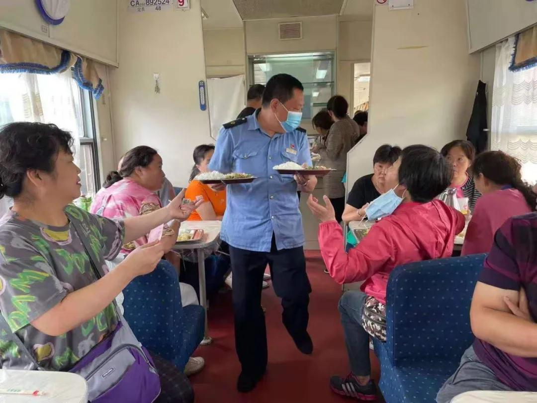 在途中受阻的旅客列車上,鄭州客運段乘務人員耐心與旅客溝通,安撫旅客情緒,并積極聯系相關車站運送餐料,盡全力保證旅客所需。