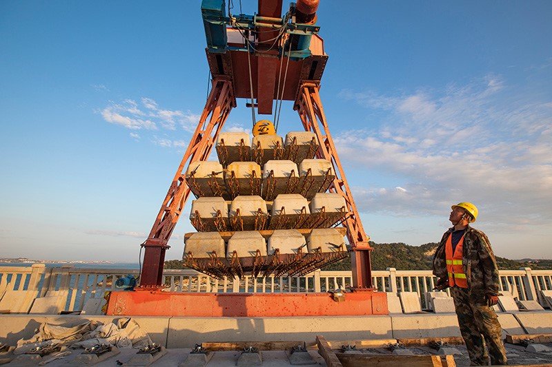 工人在新建福廈鐵路湄洲灣跨海大橋施工。