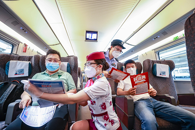 在重慶北站一列車上,來自中國鐵路成都局集團有限公司重慶客運段和重慶鐵路公安處的普法宣傳志愿者在給旅客講解鐵路安全法律法規相關知識。
