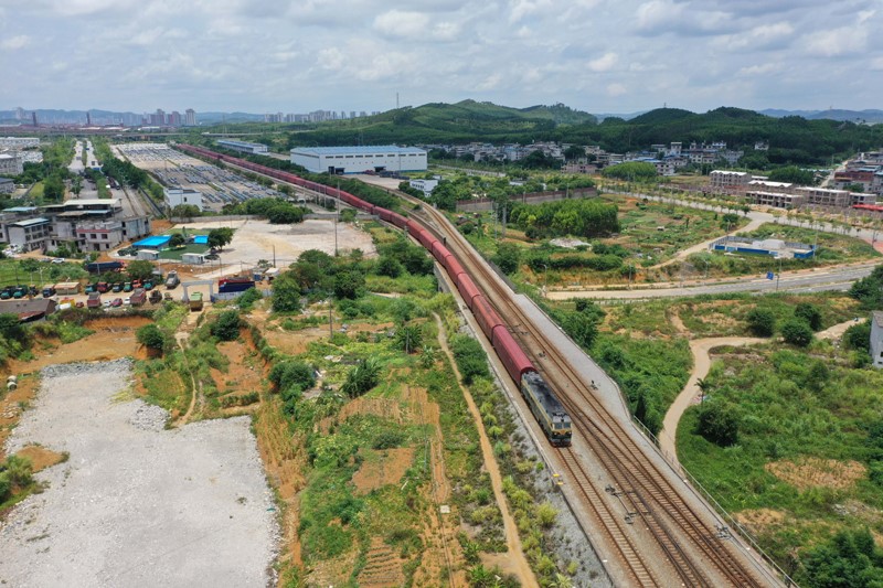 滿載外運小汽車的貨運列車駛出廣西柳州雒容汽車物流基地。