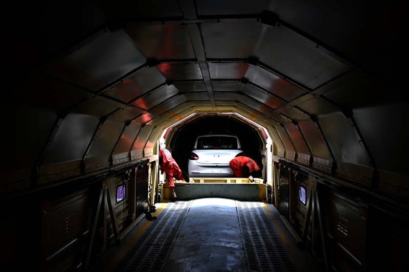這些小汽車“乘坐”的火車是JSQ6型雙層運輸汽車專用鐵路貨車,每節車廂兩端都可以打開,在車廂連接處鋪上擋板,相鄰的車廂就可以連起來形成通道。每節車廂可以裝載9至15輛小汽車。其中一部分小汽車會“坐”著火車,通過鐵海聯運班列運往海外。