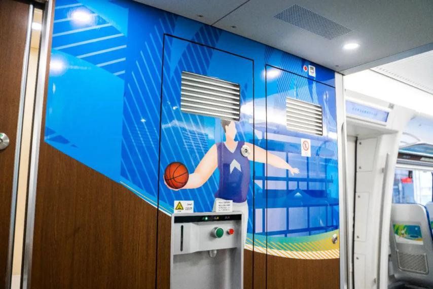 列車采用大運會元素涂裝,彰顯成都青春靚麗迎大運的風采。外觀是大熊貓和運動健兒奔跑的卡通形象,活力四射、充滿動感;內部選用清爽的深藍底色,車門貼、行李架裝飾貼、頭巾片上有許多奔跑、揮拍、投籃的形象,色彩明快、格外醒目。此次大運會期間共有兩組“大運號”旅游主題列車在成渝高鐵和成都市域環線亮相運行。