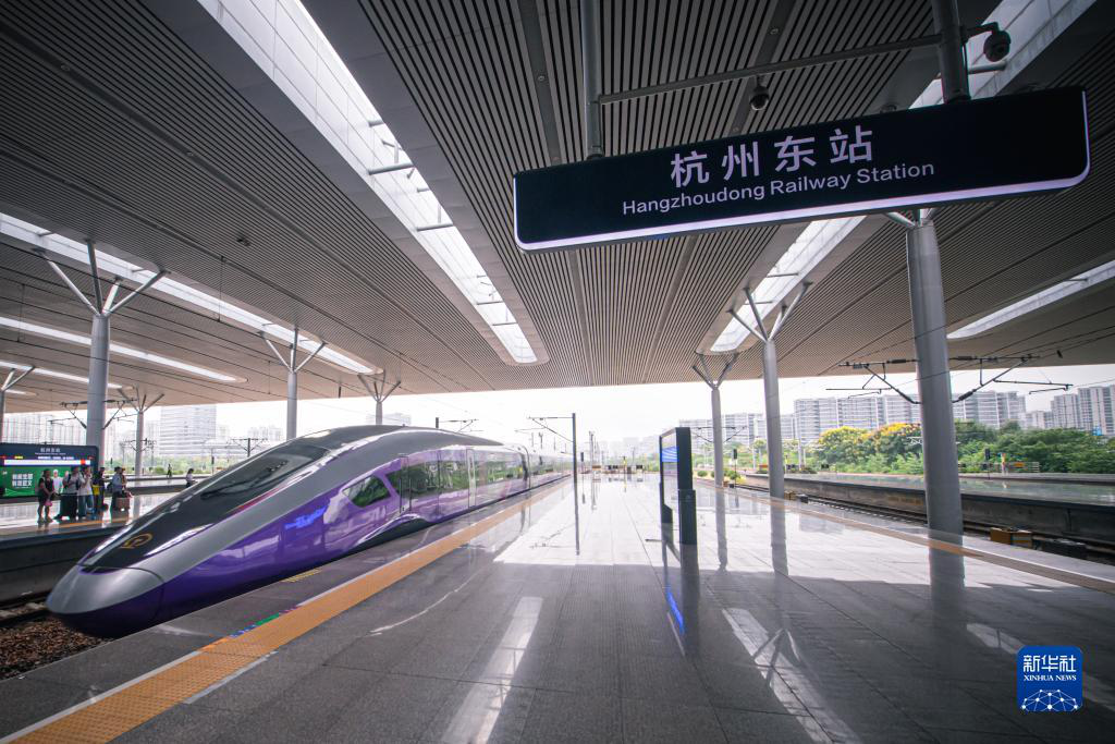 復(fù)興號亞運智能動車組列車駛?cè)牒贾輺|站。