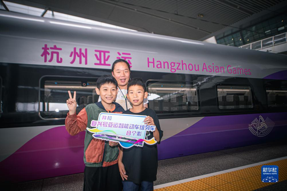 杭州東站站臺,小乘客們與復(fù)興號亞運智能動車組列車合影留念。