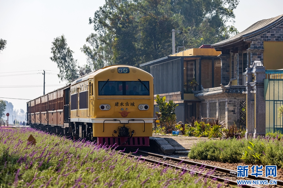 云南省紅河州建水縣,一列“建水古城號”米軌小火車穿行在線路上。