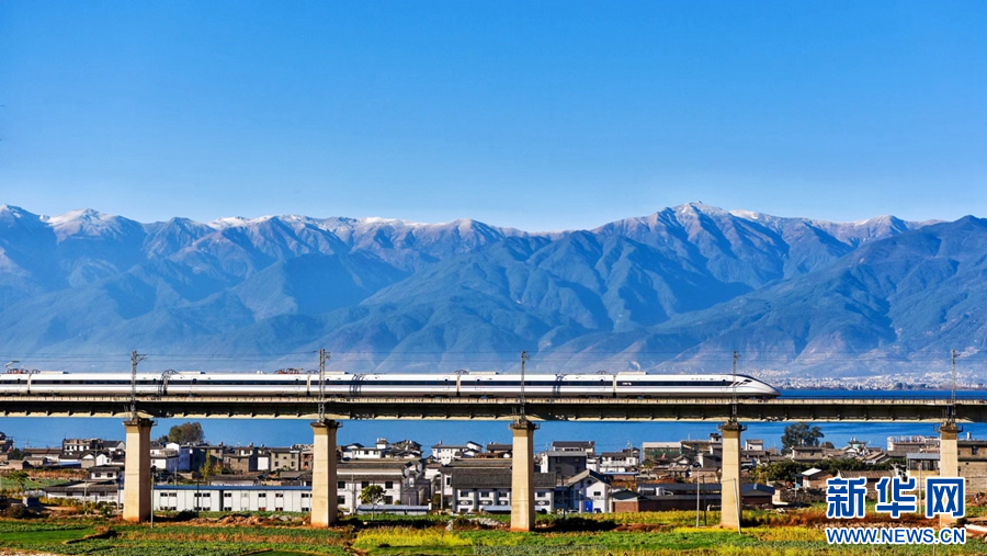云南省昆明市,復興號動車穿行在城市之中,遠處的湖泊為“高原明珠”滇池。