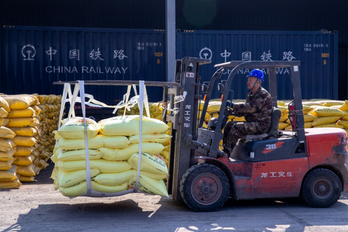 3月13日,在中國鐵路哈爾濱局集團有限公司大慶車務段肇東站貨場,工作人員用叉車運送化肥。