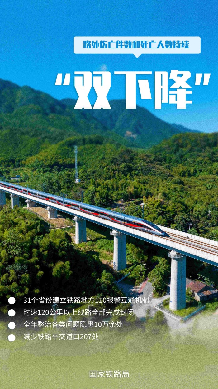 近年來,各地區、各有關部門和單位合力共為、攻堅克難,充分發揮鐵路沿線安全環境治理部際聯席會議制度作用,鐵路沿線安全環境治理工作取得積極成效。鐵路線路安全保護區全面劃定,31個省份建立鐵路地方110報警互通機制,時速120公里以上線路全部完成封閉,減少鐵路平交道口1047處,鐵路交通路外相撞事故件數和死亡人數持續保持雙下降。