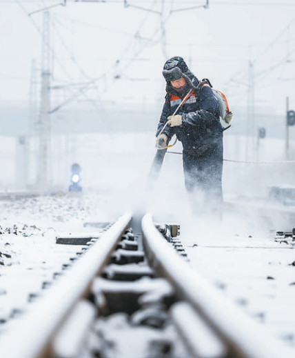 春運期間,中國鐵路沈陽局集團公司阜新工務段職工進行道岔除雪作業,保障運輸安全。