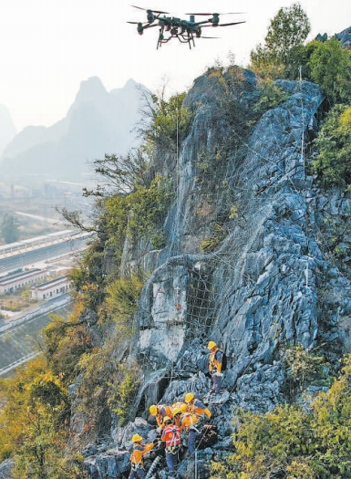 黔桂鐵路一處沿線山體上,中國鐵路南寧局集團公司柳州工務段橋隧工用無人機運輸的材料整治危石。