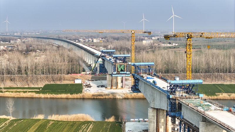 阜淮鐵路跨渦河特大橋連續(xù)梁施工現(xiàn)場。