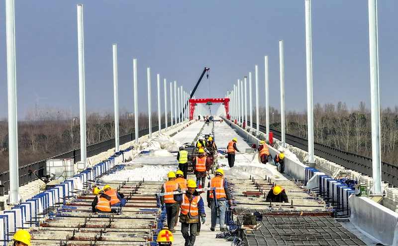 阜淮鐵路項(xiàng)目建設(shè)者在蒙城特大橋施工。