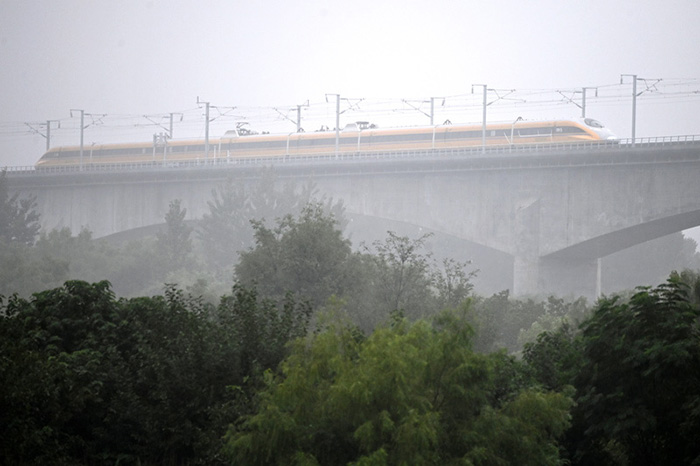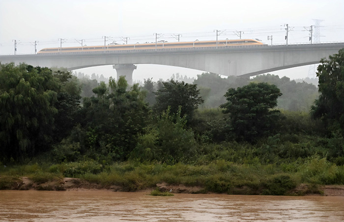 聯調聯試綜合檢測列車駛過位于陜西省西安市的西延高鐵渭河特大橋。