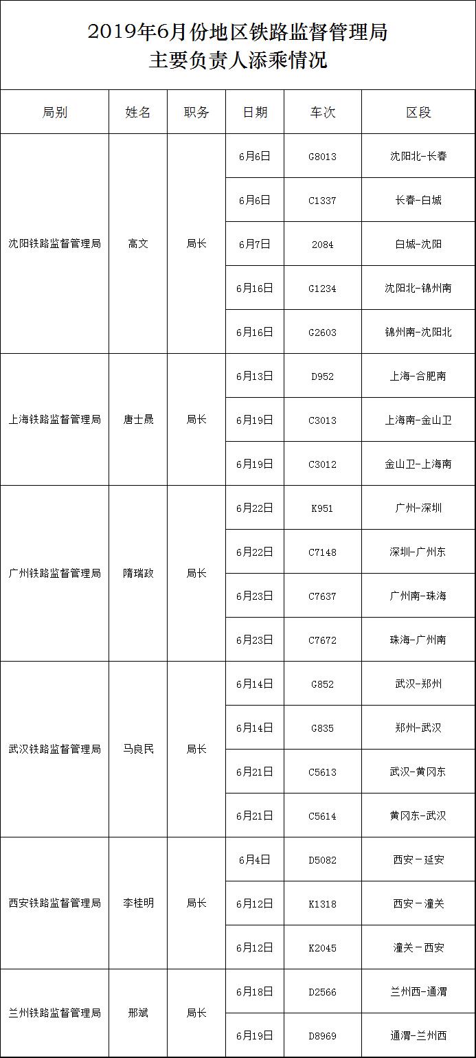 2019年6月份地區(qū)鐵路監(jiān)督管理局主要負責人添乘情況