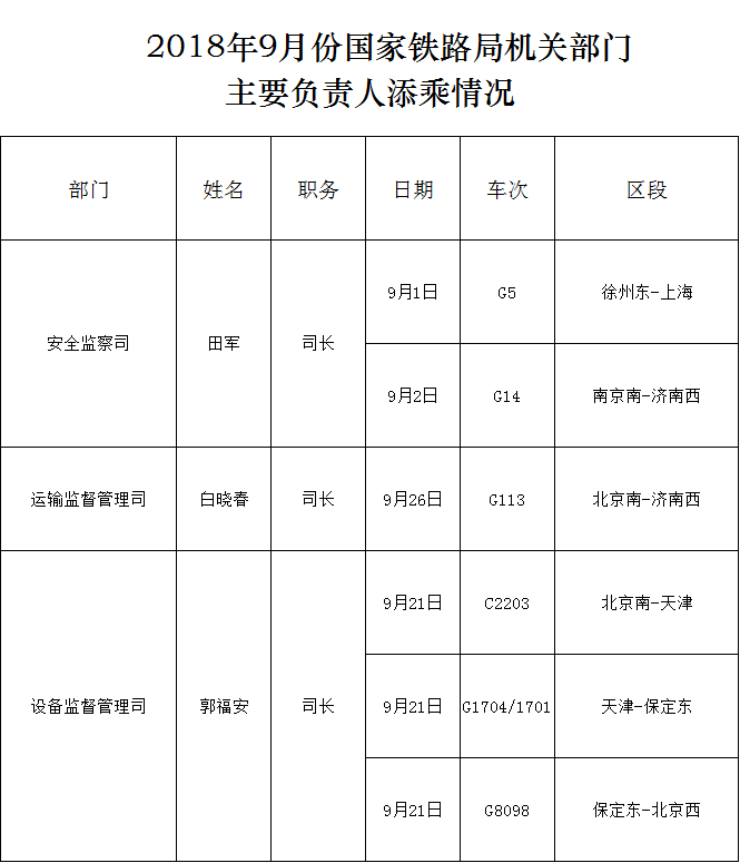 2018年9月份國家鐵路局機(jī)關(guān)部門主要負(fù)責(zé)人添乘情況