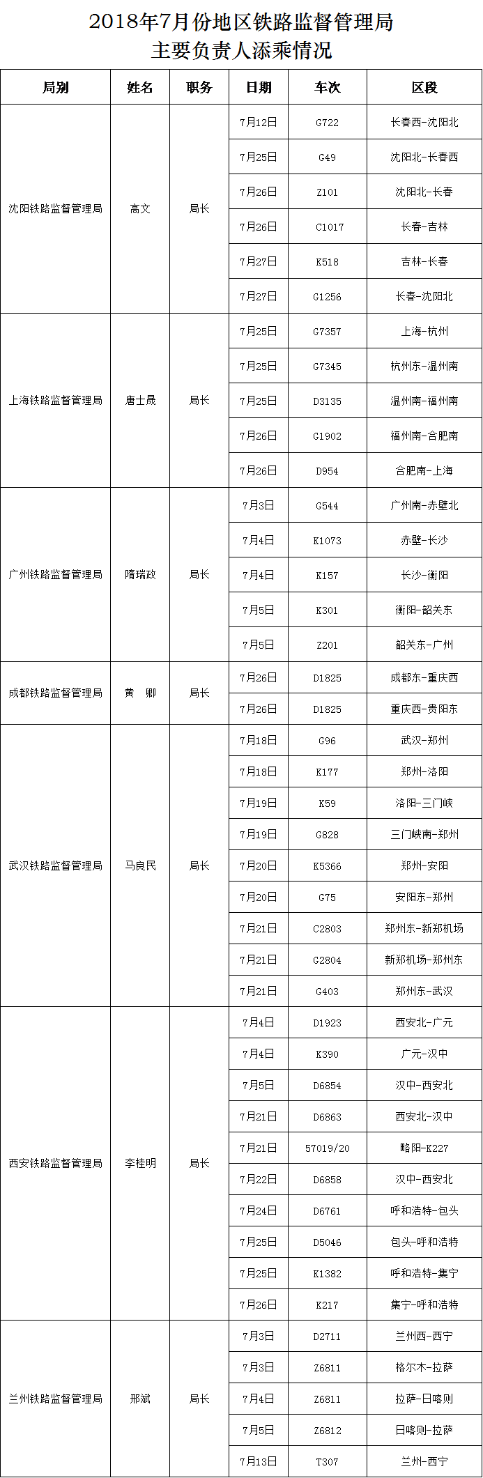 2018年7月份地區鐵路監督管理局主要負責人添乘情況