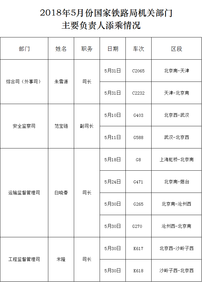 2018年5月份國家鐵路局機關部門主要負責人添乘情況